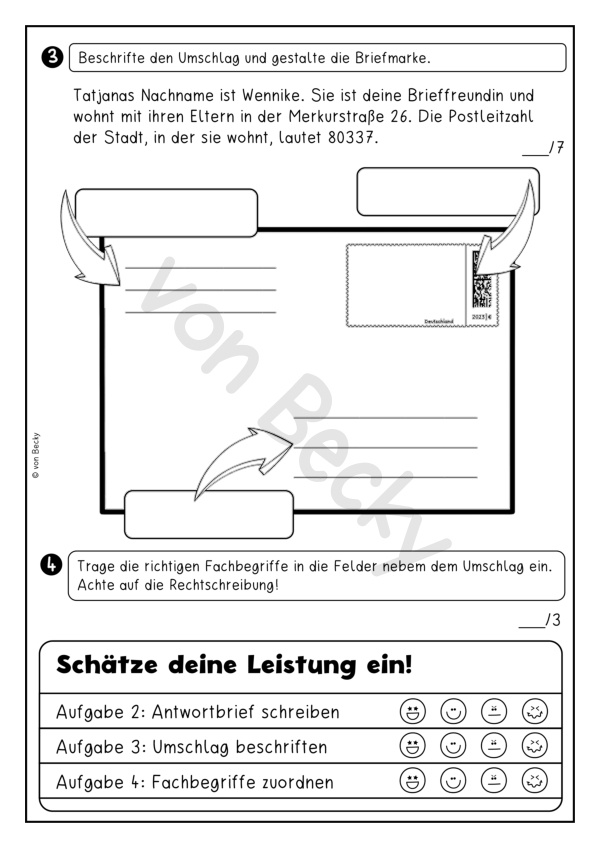 Ebenfalls enthalten ist eine Probe. Auch hier verfassen die Kinder zu einem vorgegebenen Brief einen Antwortbrief. Auf einer weiteren Probeseite kann (muss aber nicht) die Umschlagbeschriftung abgefragt werden. Übungen dazu findest du in meinem Set zum „Weg des Briefes (einen Brief aufgeben)“.