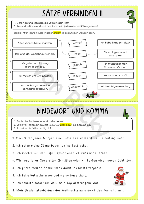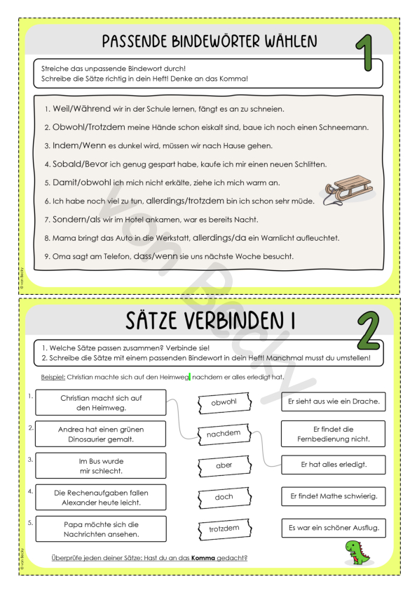 Diese Übungskarten beinhalten wiederkehrende Aufgabenformate zur Übung der Bindewörter. Die Kinder schreiben dabei in ihr Heft (alternativ auf ein Blockblatt).
